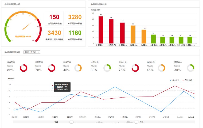 針對單位組織數據生命周期各階段活動,數據安全綜合評估系統可依據前置數據采集和分析結果,自動完成生命周期各階段的風險分析,生成數據資產的全面風險清單和風險預估,同時評估完成后可自動形成可視化報表,如下圖所示: