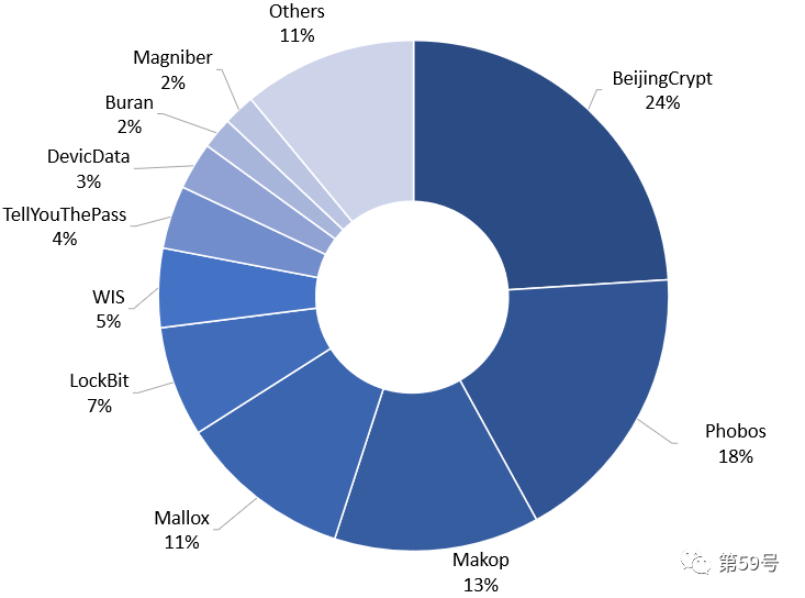 下圖是美創第59號實驗室對勒索病毒監測后所計算出的11月份勒索病毒家族流行度占比分布圖。BeijingCrypt、Phobos、Makop三大勒索病毒家族的受害者占比最多。