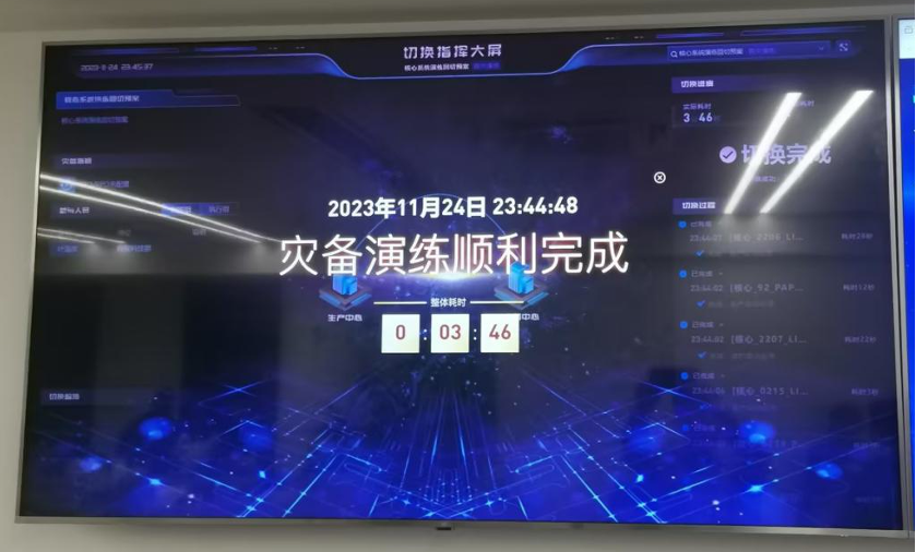 切換后,業(yè)務(wù)人員充分驗(yàn)證異地災(zāi)備系統(tǒng)的數(shù)據(jù)完整性和業(yè)務(wù)可用性,執(zhí)行小組于當(dāng)晚23點(diǎn)41分進(jìn)行一鍵業(yè)務(wù)回切,僅耗時(shí)3分46秒完成業(yè)務(wù)恢復(fù)。