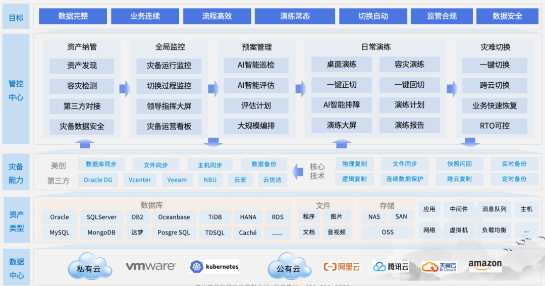 美創新一代災備一體化平臺(DRCC)以“數據完整、業務連續、流程高效、演練常態、切換自動、監管合規、數據安全”為核心目標,整合多項關鍵技術。