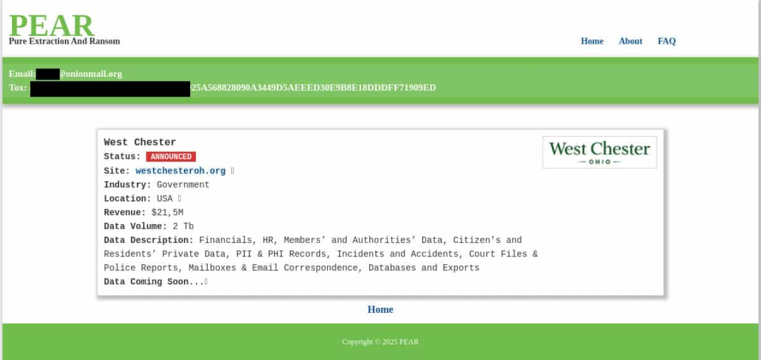 PEAR勒索組織稱對本月初俄亥俄州西切斯特鎮遭受的網絡攻擊負責。8月12日,西切斯特鎮政府官員宣布,他們發現了一起網絡安全事件。PEAR勒索組織在2025年8月15日聲稱對此次攻擊負責,并表示竊取了2TB的數據,但西切斯特鎮尚未證實PEAR的說法。兩周后,該鎮政府官員報告了該鎮電子郵件服務器遭受的第二次攻擊事件。8月26日,該鎮表示已關閉電子郵件、電話和網站服務。據稱,鎮政府員工收到了勒索信。目前尚無勒索組織聲稱對第二次攻擊事件負責。
