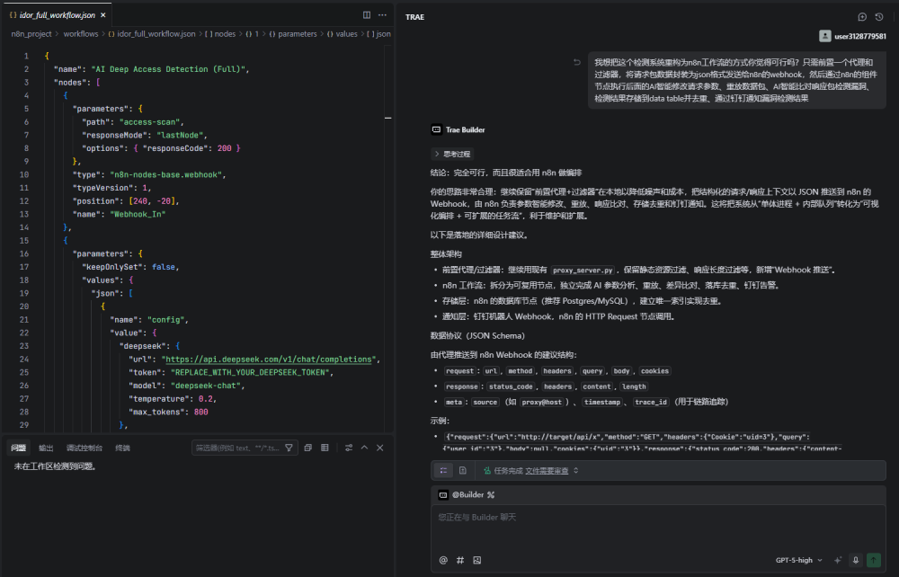 如此以來,就對整個檢測系統進行了解耦,N8N作為檢測中樞,其中的所有模塊都可以復用,如流量解析、請求重放、去重、告警通知等,如果想要測試其他漏洞,只需修改AI節點中的提示詞即可,從維護和擴展上來說,都非常的方便直觀。對于測試人員來說,不需要知道檢測系統怎么啟動運行,只需要啟動一個代理接入即可;對于設計人員來說,只需要在N8N工作流平臺中進行流程設計即可。這樣的模式對于集成到CI/CD會更有優勢。